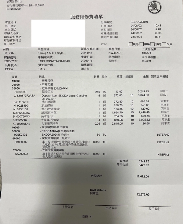 原廠1.5 第十次自費保養工單